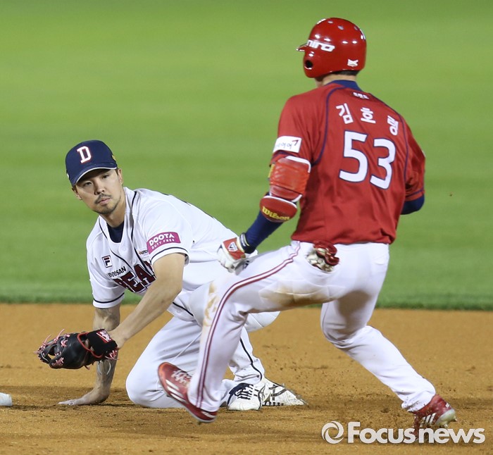 (서울=포커스뉴스) 19일 서울 잠실구장에서 열린 2016프로야구 KIA-두산 경기 7회초 KIA 선두타자 김호령이 좌전 안타를 치고 2루까지 달리다 두산 2루수 오재원에게 태그아웃되고 있다.