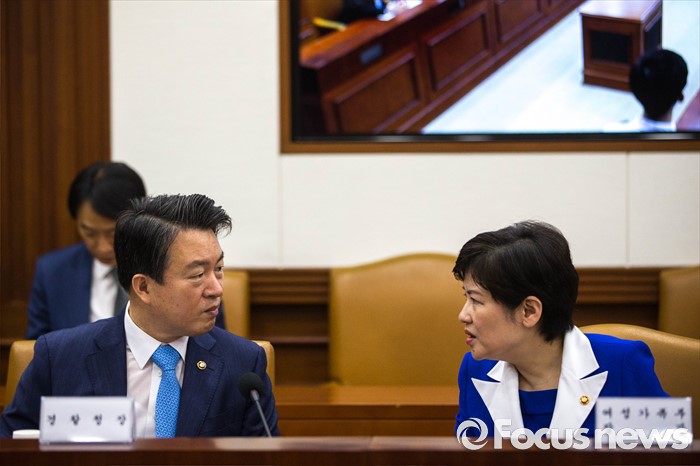 (서울=포커스뉴스) 20일 오전 서울 종로구 정부서울청사에서 열린 사회관계장관회의에 자리한 강신명(왼쪽) 경찰청장과 강은희 여성가족부 장관이 대화를 나누고 있다.