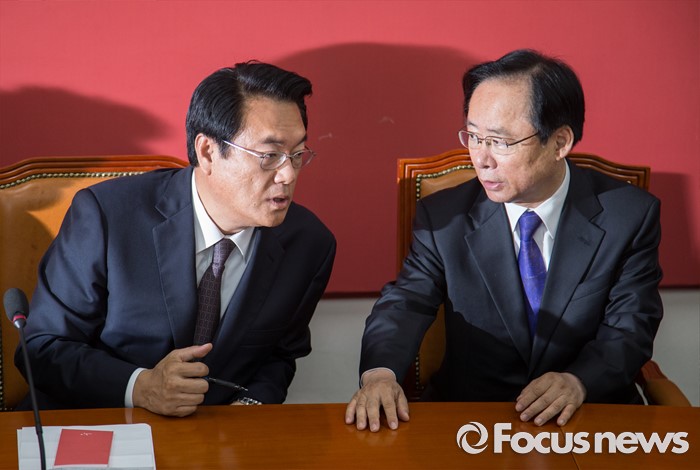 (서울=포커스뉴스) 정진석(왼쪽) 새누리당 원내대표와 이주영 의원이 20일 오전 서울 여의도 국회에서 열린 원내지도부-중진의원 연석회의에 참석해 논의하고 있다.