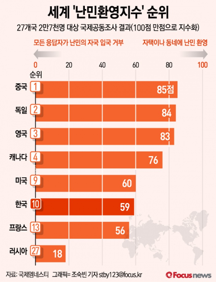 (서울=포커스뉴스) 국제앰네스티(AI)는 컨설팅업체 글로브스캔에 의뢰해 27개국 2만7천명을 대상으로 한 국제공동조사 결과, 난민환영지수를 최하 0점부터 최대 100점으로 환산했을 때 85점으로 중국이 1위를 기록했다고 밝혔다.