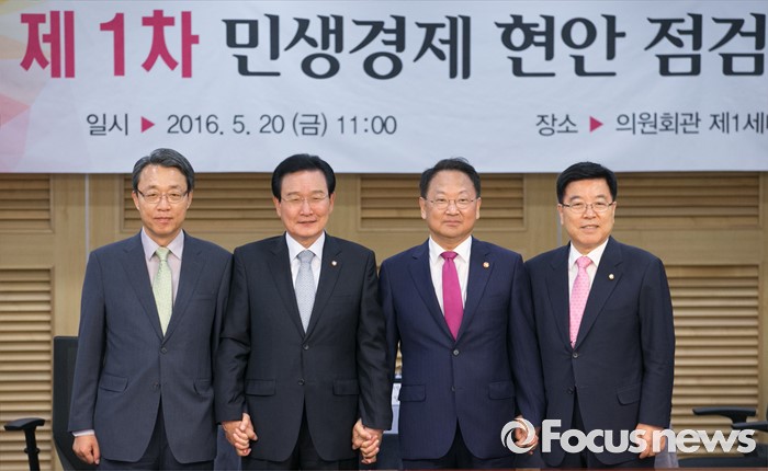 (서울=포커스뉴스) 20일 오전 서울 여의도 국회 의원회관에서 열린 1차 민생경제현안점검회의에 참석한 3당 정책위의장과 유일호 경제부총리 겸 기획재정부 장관이 취재진을 향해 포즈를 취하고 있다. 왼쪽부터 김성식 국민의당 정책위의장, 변재일 더불어민주당 정책위의장, 유 부총리, 김광림 새누리당 정책위의장.