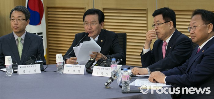 (서울=포커스뉴스) 20일 오전 서울 여의도 국회 의원회관에서 열린 1차 민생경제현안점검회의에 참석한 변재일 더불어민주당 정책위의장이 모두발언을 하고 있다. 왼쪽부터 김성식 국민의당 정책위의장, 변재일 더불어민주당 정책위의장, 김광림 새누리당 정책위의장, 유일호 경제부총리 겸 기획재정부 장관.