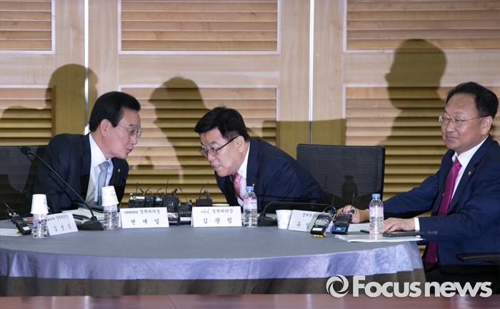 (서울=포커스뉴스) 20일 오전 서울 여의도 국회 의원회관에서 열린 1차 민생경제현안점검회의에 참석한 김광림(가운데) 새누리당 정책위의장과 변재일(왼쪽) 더불어민주당 정책위의장이 대화하고 있다. 오른쪽은 유일호 경제부총리 겸 기획재정부 장관.