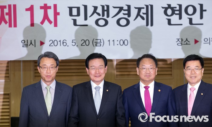 (서울=포커스뉴스) 20일 오전 서울 여의도 국회 의원회관에서 열린 1차 민생경제현안점검회의에 참석한 3당 정책위의장과 유일호 경제부총리 겸 기획재정부 장관이 취재진을 향해 포즈를 취하고 있다. 왼쪽부터 김성식 국민의당 정책위의장, 변재일 더불어민주당 정책위의장, 김광림 새누리당 정책위의장, 유 부총리.