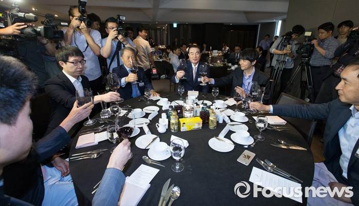 (서울=포커스뉴스) 이세돌 9단, 양건 프로기사회 회장을 비롯한 내빈들이 20일 오전 서울 종로구 플라자호텔에서 열린 한국기원 맥심커피배 시상식에 참석해 건배를 하고 있다.