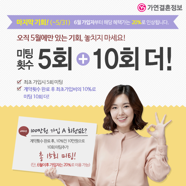 가연 관계자는 "평소 결혼정보회사 가연의 가입을 고민 중이었던 소비자들이 더 많은 미팅 기회를 누릴 수 있는 마지막 기회다"고 설명했다.6월부터 '5+10 추가약정서비스'의 가격이 인상된다.<사진제공=가연>