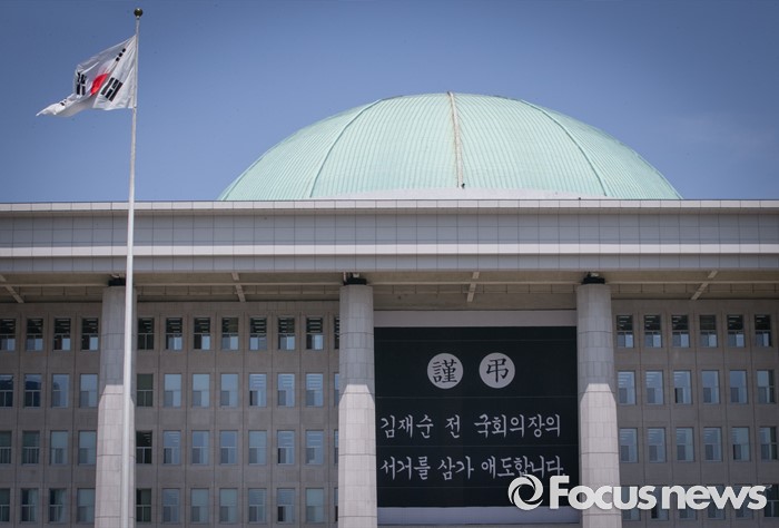 (서울=포커스뉴스) 20일 오전 서울 여의도 국회 본청에 지난 17일 별세한 김재순 전 국회의장을 추모하는 현수막이 걸려 있다.