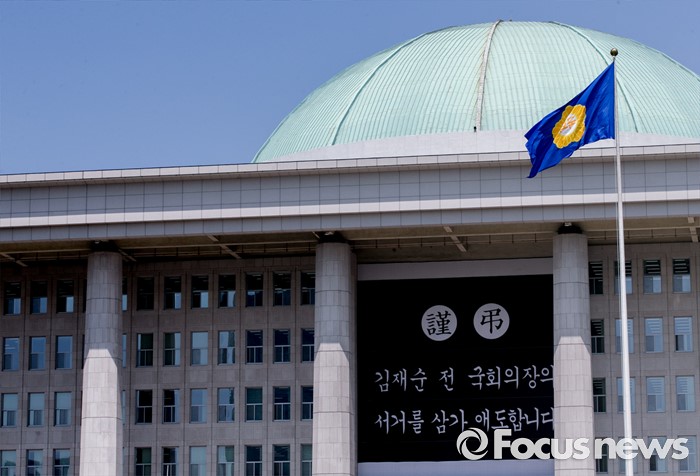 (서울=포커스뉴스) 20일 오전 서울 여의도 국회 본청에 지난 17일 별세한 김재순 전 국회의장을 추모하는 현수막이 걸려 있다.