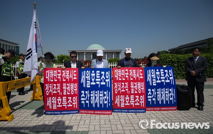 (서울=포커스뉴스) 한 보수 단체가 20일 오전 서울 여의도 국회 앞에서 세월호 특조위 해체를 촉구하는 시위를 하고 있다.