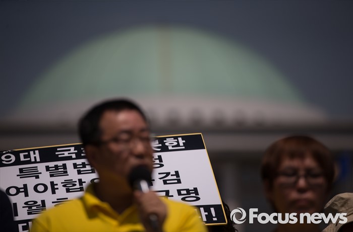 (서울=포커스뉴스) 4.16연대가 20일 오전 서울 여의도 국회 앞에서 19대 국회 세월호 특별법 개정 특검 무산에 대한 입장발표 기자회견 갖고 있다.
