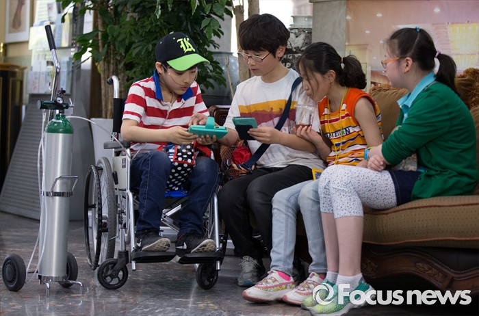 (대전=포커스뉴스) 아타 사프달 옥시레킷벤키저 대표와 임원진이 20일 오후 대전 유성구 아드리아호텔에서 옥시의 가습기 살균제 제품 피해자와 면담을 마련한 가운데 피해 어린이들이 핸드폰 게임을 하고 있다.