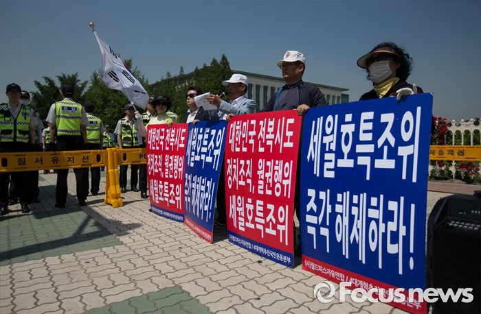 (서울=포커스뉴스) 한 보수 단체가 20일 오전 서울 여의도 국회 앞에서 세월호 특조위 해체를 촉구하는 시위를 하고 있다.
