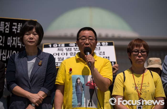 (서울=포커스뉴스) 4.16연대가 20일 오전 서울 여의도 국회 앞에서 19대 국회 세월호 특별법 개정 특검 무산에 대한 입장발표 기자회견 갖고 있다.