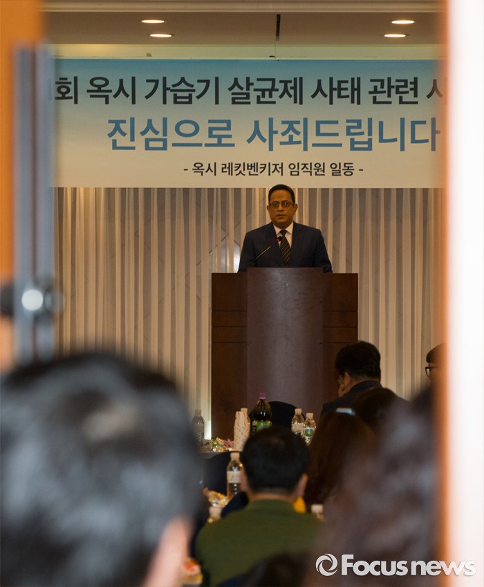 (대전=포커스뉴스) 아타 사프달 옥시레킷벤키저 대표와 임원진이 20일 오후 대전 유성구 아드리아호텔에서 옥시의 가습기 살균제 제품 피해자와 면담을 하고 있다.