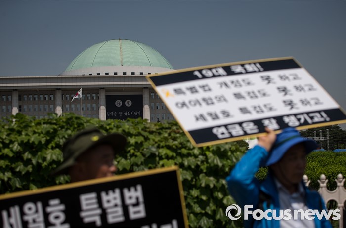 (서울=포커스뉴스) 4.16연대가 20일 오전 서울 여의도 국회 앞에서 19대 국회 세월호 특별법 개정 특검 무산에 대한 입장발표 기자회견 갖고 있다.