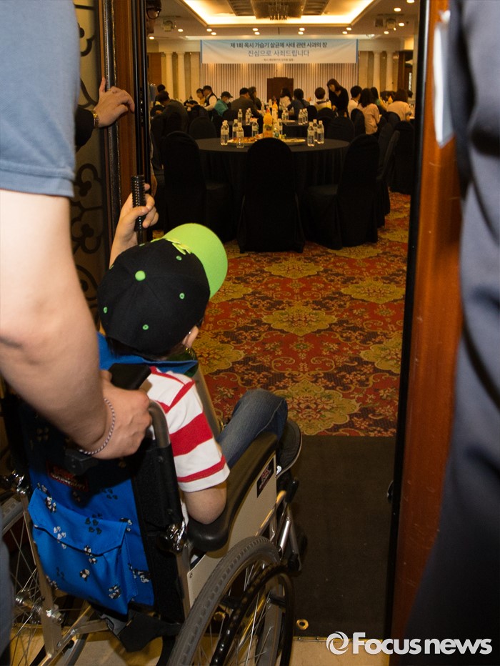 (대전=포커스뉴스) 아타 사프달 옥시레킷벤키저 대표와 임원진이 20일 오후 대전 유성구 아드리아호텔에서 옥시의 가습기 살균제 제품 피해자와 면담을 마련한 가운데 피해 어린이가 입장하고 있다.