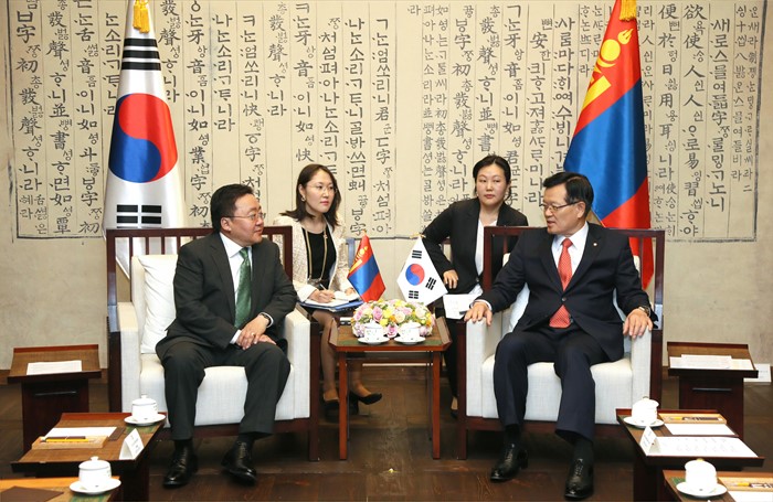 (서울=포커스뉴스) 정의화(오른쪽) 국회의장이 20일 오전 서울 여의도 국회 의장접견실에서 차히아 엘벡도르지(ELBEGDORJ Tsakhia) 몽골 대통령을 만나 양국간 우호 협력관계 증진 방안에 대해 논의하고 있다. <사진제공=국회>