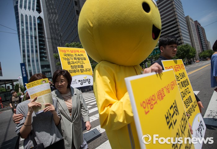 (서울=포커스뉴스) 심상정(왼쪽 두번째) 정의당 대표가 20일 오전 서울 여의도역 사거리 앞에서 가습기 살균제 참사 관련 대국민 캠페인을 하던 중 울음을 터트린 한 살균제 피해자를 안아주고 있다.