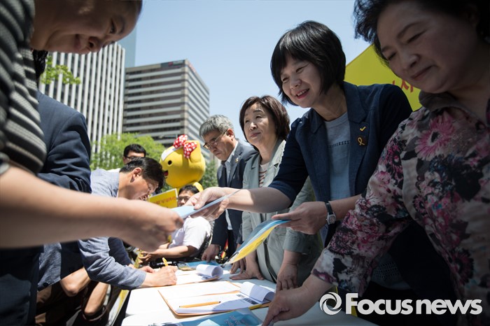 (서울=포커스뉴스) 심상정(오른쪽 세번째) 정의당 대표와 가습기 살균제 피해자들이 20일 오전 서울 여의도역 사거리 앞에서 가습기 살균제 참사 관련 대국민 캠페인을 하고 있다.