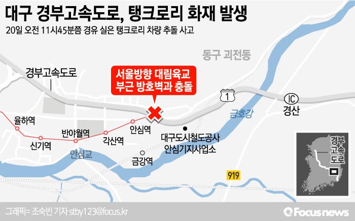(서울=포커스뉴스) 20일 오전 11시45분쯤 대구 경부고속도로 경산나들목 인근에서 경유를 싣고 가던 탱크로리가 도로 인근 방호벽과 충돌하는 사고가 발생했다.