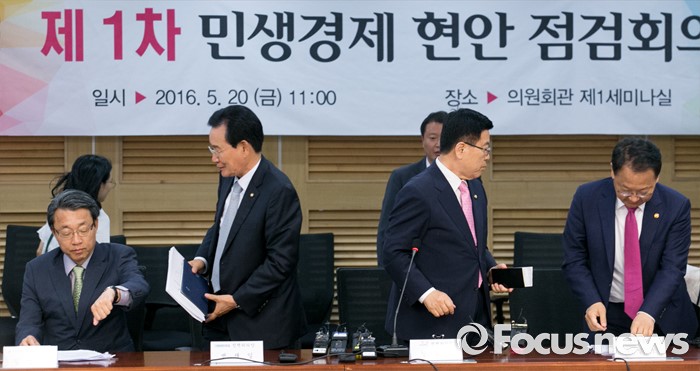 (서울=포커스뉴스) 20일 오후 서울 여의도 국회 의원회관에서 1차 민생경제 현안 점검회의를 마친 3당 정책위의장과 유일호 경제부총리 겸 기획재정부 장관이 취재진을 대상으로 결과 브리핑 후 퇴장하고 있다. 왼쪽부터 김성식 국민의당 정책위의장, 변재일 더불어민주당 정책위의장, 김광림 새누리당 정책위의장, 유 부총리.