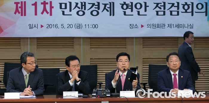 (서울=포커스뉴스) 20일 오후 서울 여의도 국회 의원회관에서 1차 민생경제 현안 점검회의를 마친 3당 정책위의장과 유일호 경제부총리 겸 기획재정부 장관이 취재진을 대상으로 결과 브리핑을 하고 있다. 왼쪽부터 김성식 국민의당 정책위의장, 변재일 더불어민주당 정책위의장, 김광림 새누리당 정책위의장, 유 부총리.