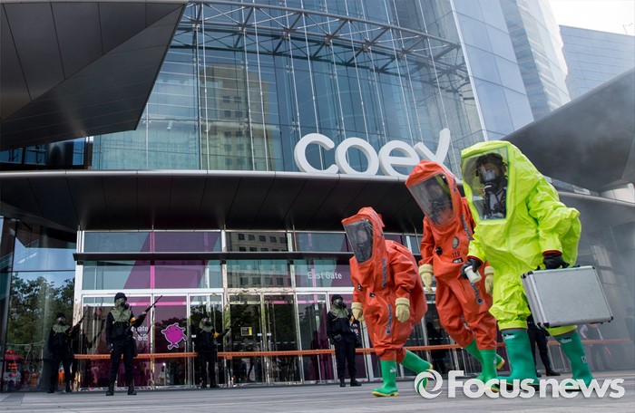 (서울=포커스뉴스) 20일 오후 서울 강남구 코엑스에서 열린 '2016 재난대응 안전한국훈련'에 참여한 훈련병력들이 테러대응훈련을 펼치고 있다.