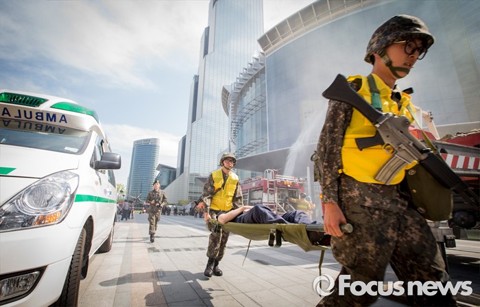 (서울=포커스뉴스) 20일 오후 서울 강남구 코엑스에서 열린 '2016 재난대응 안전한국훈련'에 참여한 훈련병력들이 테러대응훈련을 펼치고 있다.