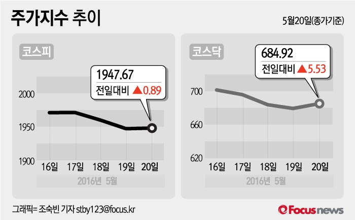(서울=포커스뉴스) 20일 코스피지수는 전날 보다 0.05%(0.89포인트) 오른 1947.67에 장을 마쳤다. 코스닥지수는 전일 대비 0.81%(5.53포인트) 오른 684.92에 마감했다.