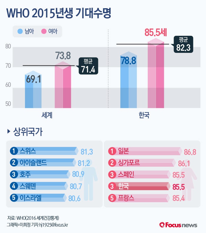 (서울=포커스뉴스) 19일 WHO 보고서에 따르면 지난해 한국에서 태어난 아기의 기대 수명은 82.3세다. 여아 기대수명은 85.5세, 남아는 78.8세로 여성이 6.7년 더 수명이 길었다. 기대수명이 최장인 나라는 여아의 경우 86.8세인 일본이며, 남아은 81.3세인 스위스로 나타났다.