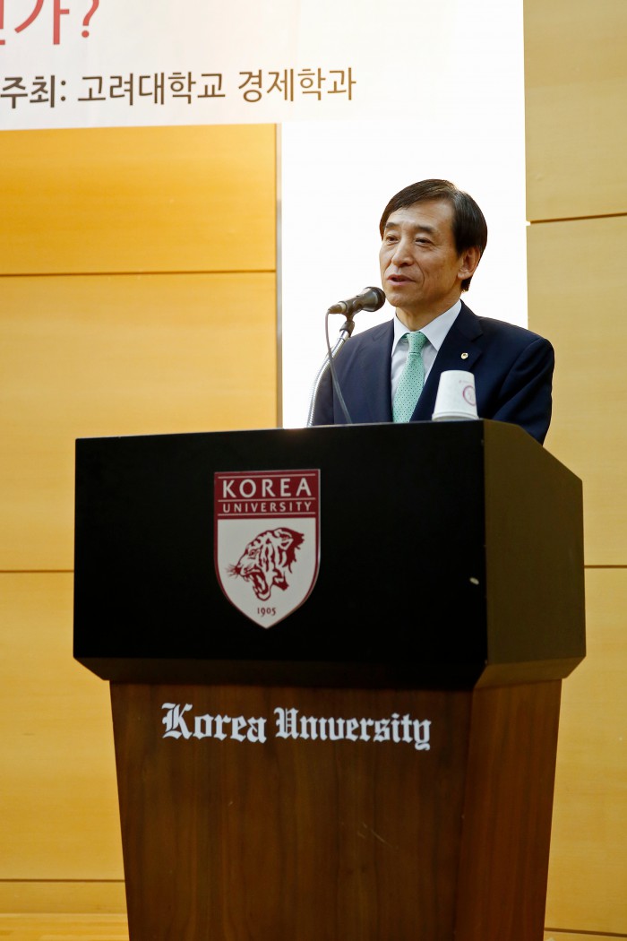 이날 이주열 총재는 고려대학교 창립 111주년 기념 강연자로 나서 '제4차 산업혁명의 도래: 어떻게 대비할 것인가'를 주제로 강연했다.20일 이주열 한국은행 총재가 서울 성북구 고려대학교에서 열린 창립 111주년 강연에서 강연을 하고 있다.<사진제공=한국은행>