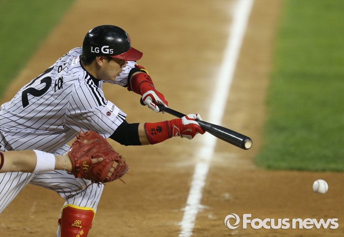 (서울=포커스뉴스) 20일 서울 잠실구장에서 열린 2016 프로야구 넥센-LG 경기 5회말 무사 1,2루에서 LG 정상호가 보내기 희생번트를 대고 있다.