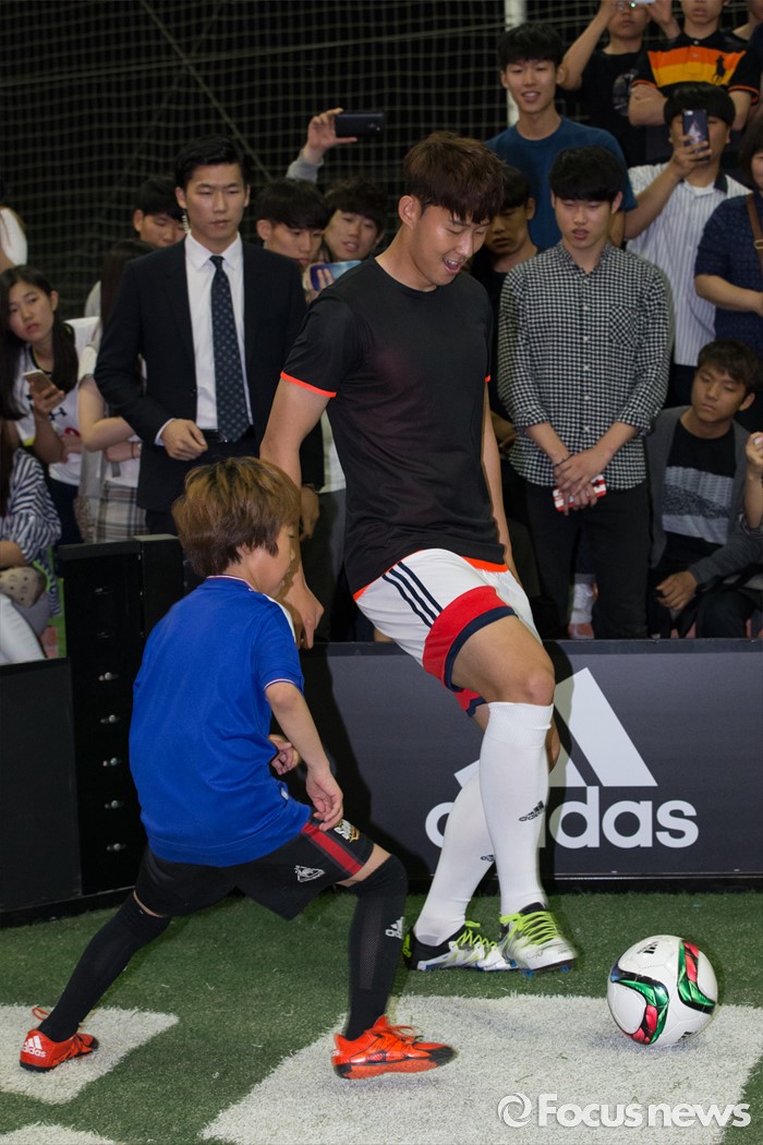 (서울=포커스뉴스) 손흥민이 20일 오후 서울 용산구 아이파크몰 풋살경기장에서 열린 아디다스 손흥민 팬미팅 및 사인회에서 팬들과 1대1 경기를 하고 있다.
