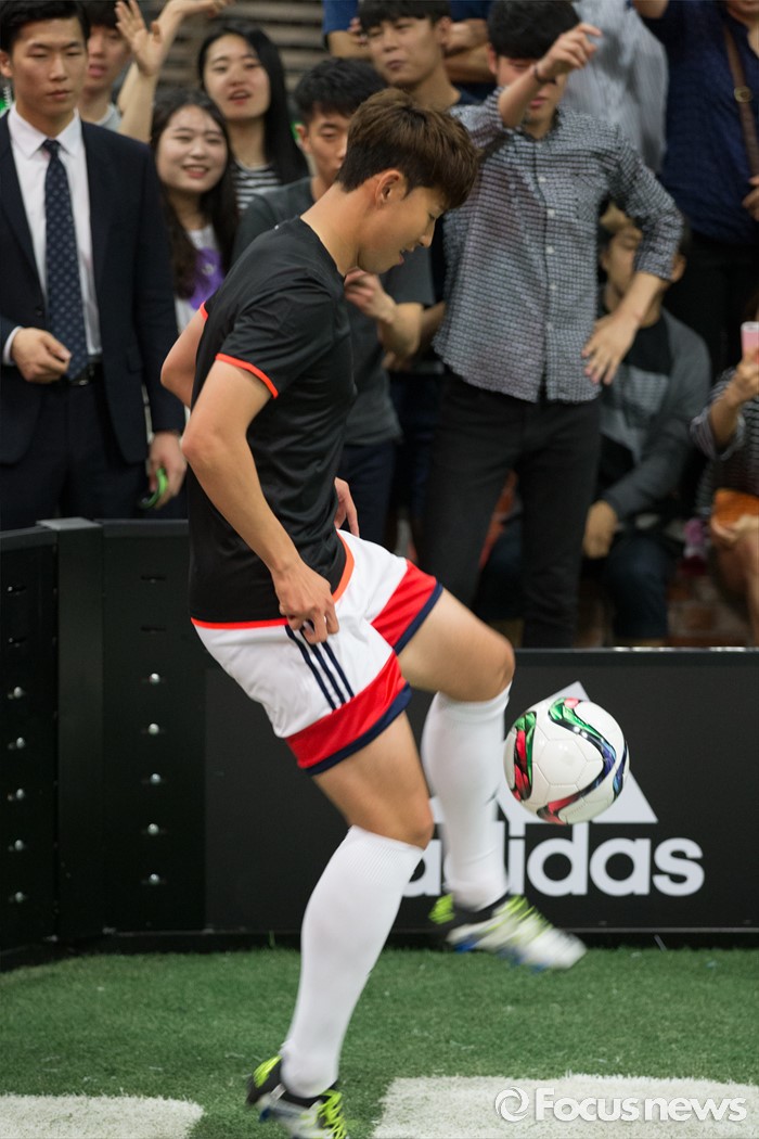 (서울=포커스뉴스) 손흥민이 20일 오후 서울 용산구 아이파크몰 풋살경기장에서 열린 아디다스 손흥민 팬미팅 및 사인회에서 팬들과 1대1 경기전 몸을 풀고 있다.
