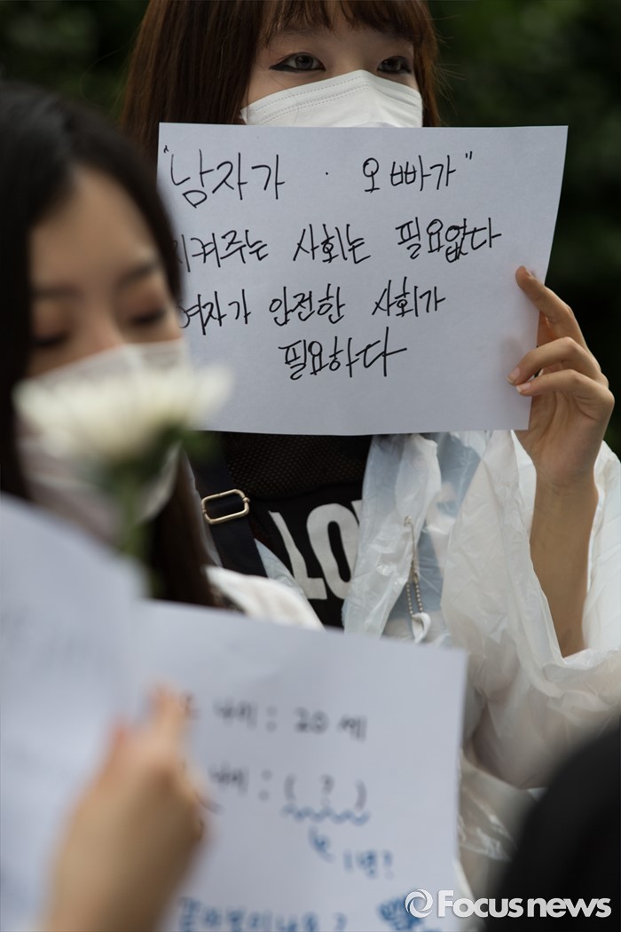 (서울=포커스뉴스) 21일 오후 서울 서초구 강남역 10번 출구 인근에서 시민들이 '강남역 여성혐오 살인사건 추모 집회'에 참석해 행진을 준비하고 있다.