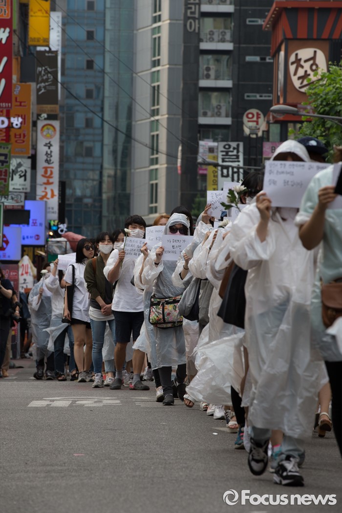 (서울=포커스뉴스) 21일 오후 서울 서초구 강남역 10번 출구 인근에서 시민들이 '강남역 여성혐오 살인사건 추모 집회'에 참석해 행진하고 있다.