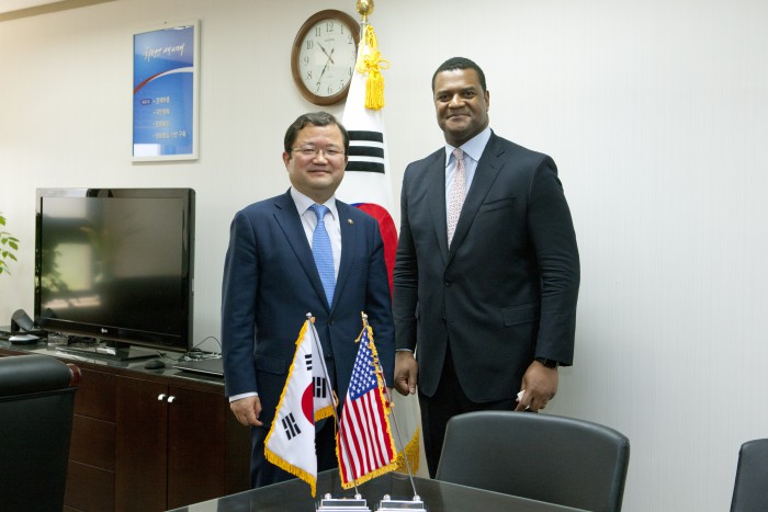 최재유 미래부 차관은 “미국과 첨단 사이버보안기술을 공동 개발하는데 이어 기업간 교류‧협력을 활성화하여 국내 산업의 경쟁력을 강화, 글로벌 시장 진출이 확대될 수 있도록 노력할 것”이라고 말했다.최재유 미래부 차관(왼쪽)과 마르커스 자도트(Marcus D. Jadotte) 미국 상무부 차관보.<사진제공=미래부>