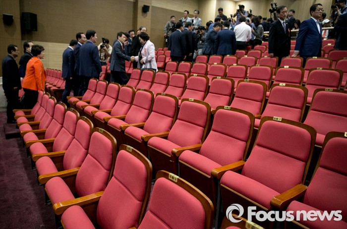 이에 정진석 원내대표는 낙선자까지 포함하는 당협위원장 총회를 소집, 총의를 모을 예정이었다.17일 오후 서울 여의도 국회 의원회관에서 비대위 구성안 및 당헌 당규개정안 등 현안 처리를 위해 예정된 4차 새누리당 전국위원회가 무산된 후 상임고문단 등 참석자들이 퇴장해 빈 자리만 보이고 있다. 이날 전국위원회의는 앞서 예정된 상임전국위원회를 개최해 당헌개정안 등을 심의할 예정이었지만, 친박계 의원들이 대거 불참해 참석자 미달로 회의가 열리지 못 했다. 2016.05.17 박동욱 기자