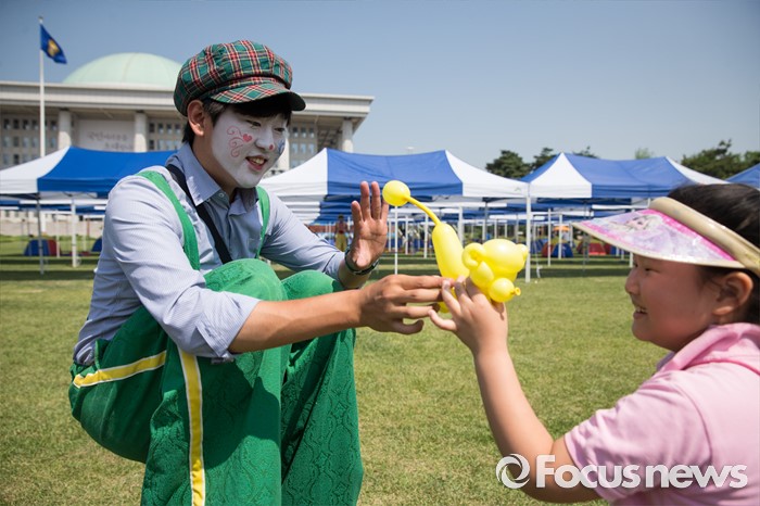 (서울=포커스뉴스) 22일 오전 서울 여의도 국회 잔디마당에서 열린 '2016 열린국회마당' 축제에서 광대가 어린이들에게 풍선 인형을 나눠주고 있다.