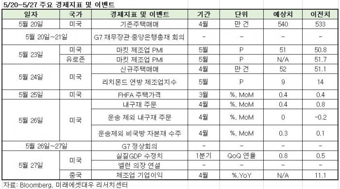 이번주 주목할 이벤트와 경제지표는 △미국 5월 마킷 제조업 구매관리지수(PMI) 발표 △주요 7개국(G7) 정상회의 등이 있다.