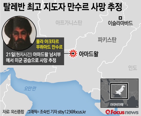 (서울=포커스뉴스) 미 CNN 등 외신은 "탈레반 최고 지도자 물라 아크타르 무하마드 만수르가 21일(현지시간) 미군의 파키스탄 공습에서 사망한 것으로 추정된다"고 복수의 국방부 관계자를 통해 밝혔다.