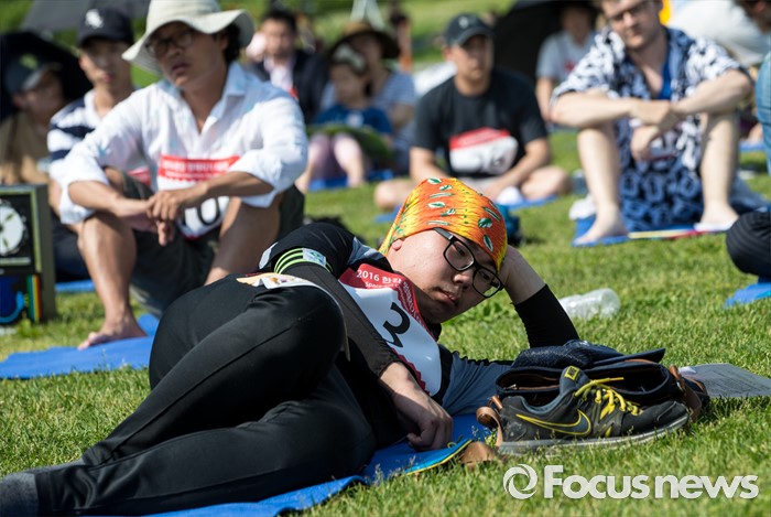 (서울=포커스뉴스) 22일 오후 서울 용산구 이촌 한강공원에서 열린 '한강 멍때리기 대회'에서 참가자들이 멍하게 앉거나 누워 있다.