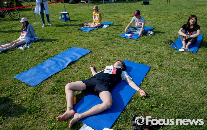(서울=포커스뉴스) 22일 오후 서울 용산구 이촌 한강공원에서 열린 '한강 멍때리기 대회'에서 참가자들이 멍하게 앉거나 누워 있다.