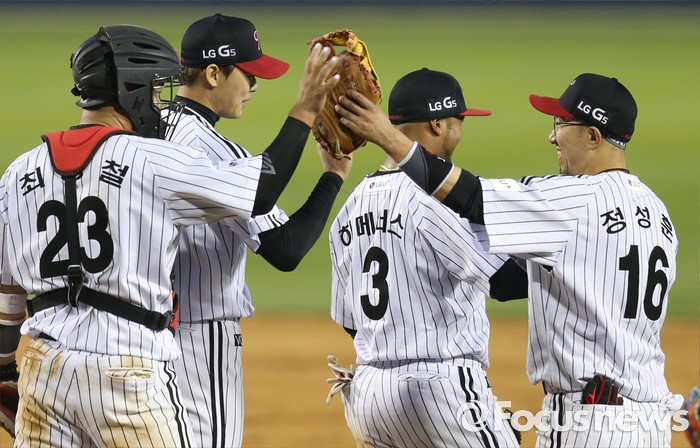 (서울=포커스뉴스) 22일 서울 잠실구장에서 열린 2016 프로야구 넥센-LG 경기에서 넥센을 물리치고 LG 마무리 투수 임정우와 정성훈이 하이파이브하고 있다.