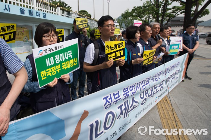 (서울=포커스뉴스) 양대노총 조합원들이 23일 오전 서울 종로구 정부서울청사 앞에서 한국정부의 불법지침과 사업장 시행 강행에 대한 ILO 제소 기자회견을 하고 있다.