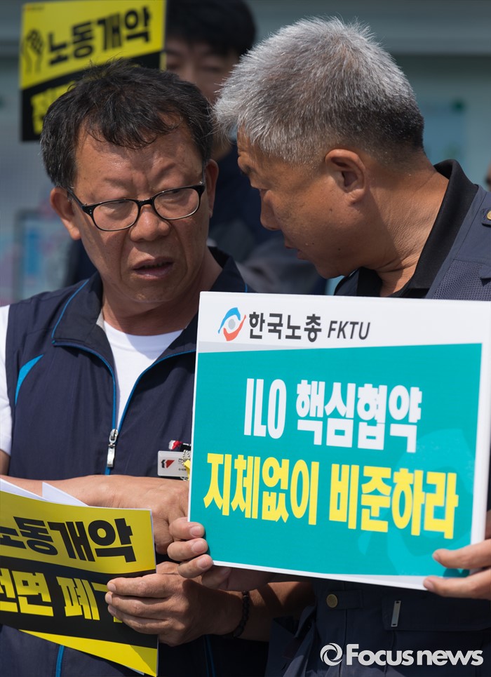 (서울=포커스뉴스) 23일 오전 서울 종로구 정부서울청사 앞에서 열린 한국정부의 불법지침과 사업장 시행 강행에 대한 ILO 제소 양대노총 기자회견에 참석한 최종진(왼쪽) 민주노총 위원장 직무대행과 김동만 한국노총 위원장이 대화하고 있다.