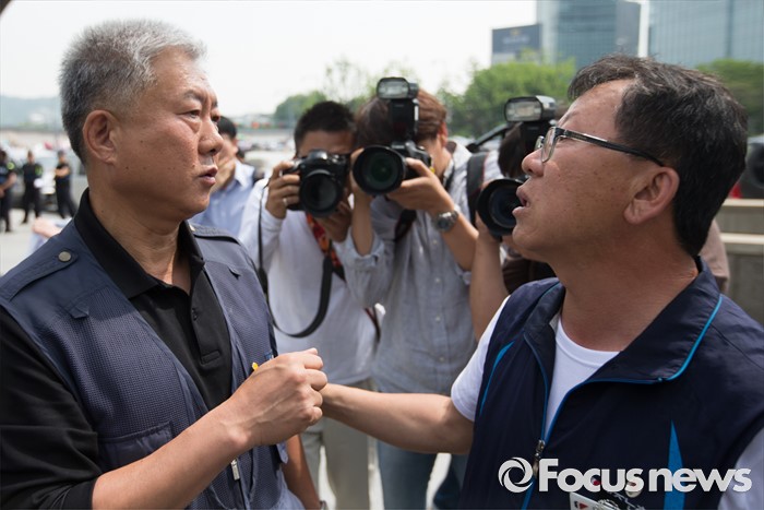 (서울=포커스뉴스) 23일 오전 서울 종로구 정부서울청사 앞에서 열린 한국정부의 불법지침과 사업장 시행 강행에 대한 ILO 제소 양대노총 기자회견에 참석한 최종진(오른쪽) 민주노총 위원장 직무대행과 김동만 한국노총 위원장이 대화하고 있다.
