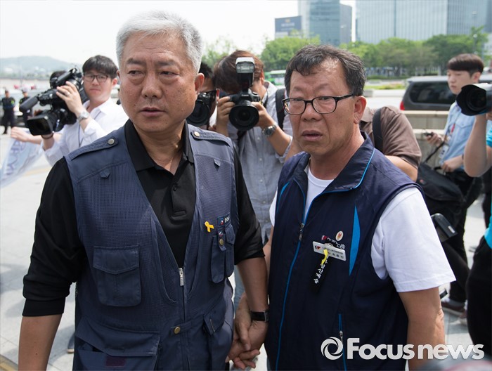 (서울=포커스뉴스) 23일 오전 서울 종로구 정부서울청사 앞에서 열린 한국정부의 불법지침과 사업장 시행 강행에 대한 ILO 제소 양대노총 기자회견에 참석한 최종진(오른쪽) 민주노총 위원장 직무대행과 김동만 한국노총 위원장이 손을 잡고 있다.