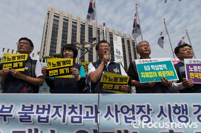 (서울=포커스뉴스) 23일 오전 서울 종로구 정부서울청사 앞에서 열린 한국정부의 불법지침과 사업장 시행 강행에 대한 ILO 제소 양대노총 기자회견에 참석한 최종진(가운데) 민주노총 위원장 직무대행이 모두발언을 하고 있다.