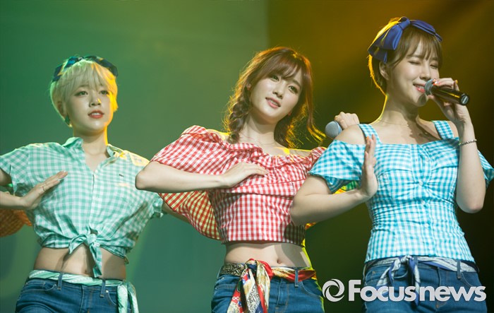 (서울=포커스뉴스) 23일 오전 서울 마포구 하나투어 브이홀에서 열린 걸그룹 타히티의 '알쏭달쏭' 쇼케이스에 참여한 멤버 아리(왼쪽부터), 지수, 미소가 무대를 선보이고 있다.